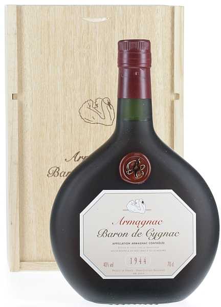 Der Jahrgangs-Armagnac von Baron Cygnac kommt in der typischen Boxbeutelflasche daher und wird zurzeit in einer Holzkiste mit Herstellerzertifikat geliefert.