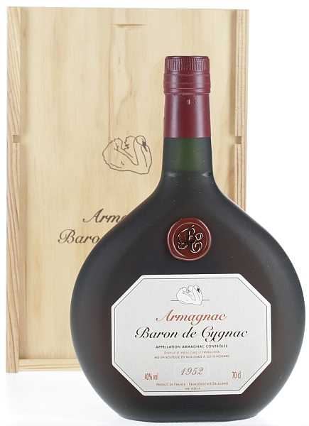 Ein Jahrgangs-Armagnac wie der aus dem Hause Baron de Cygnac ist immer eine große Besonderheit. Deshalb ist dieser Millésime aus dem Jahr 1952 für Liebhaber von edlen Weinbränden eine ausgefallene Überraschung, vor allem wenn es sich um ein rundes Jubiläum handelt. In der matten Flasche der Art einer klassischen Boxbeutelflasche und mit dem Siegel am Ansatz des Flaschenhalses vermittelt dieser Armagnac die Tradition dieses französischen Weinbrands auf eindrucksvolle Weise. Nicht umsonst reicht die Herstellung von Armagnac um Jahrhunderte weiter zurück als die seines bekannten Verwandten Cognac, von dem er sich in der Destillationsmethode und der Reifung unterscheidet. Dieser Jahrgangs-Armagnac trägt die Appellation d'Origine Contrôlée Armagnac und wurde direkt beim Erzeuger in der Gemeinde Nogaro in der Gascogne abgefüllt. Zurzeit kommt er in einer Holzkiste daher.