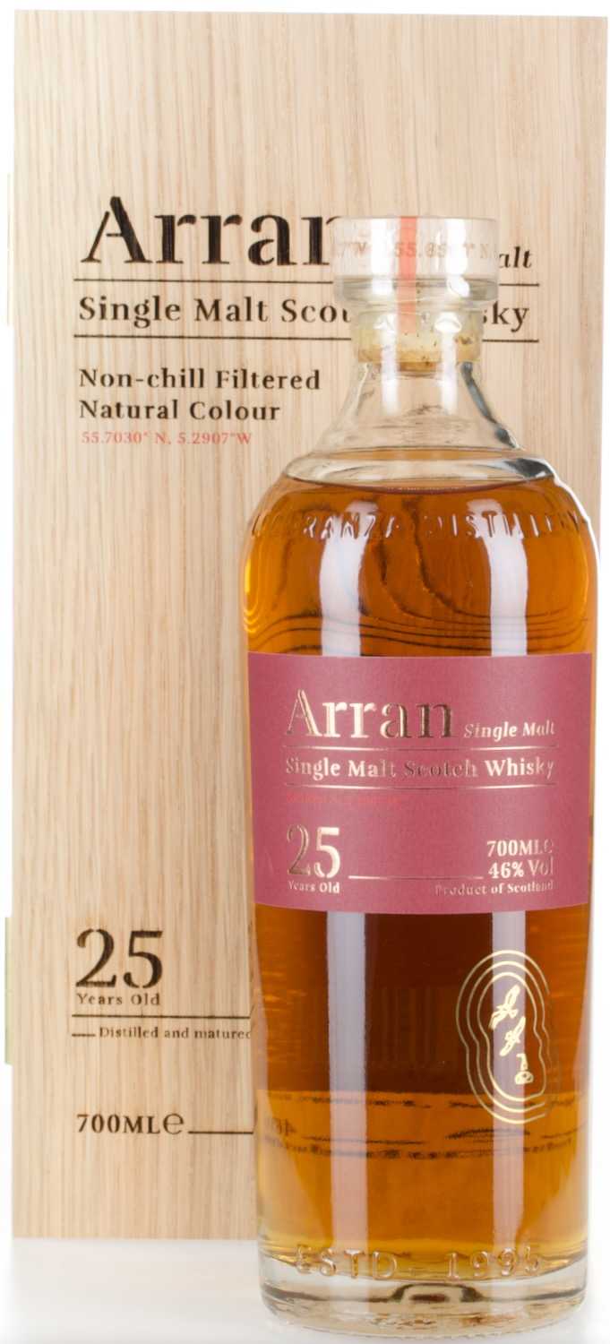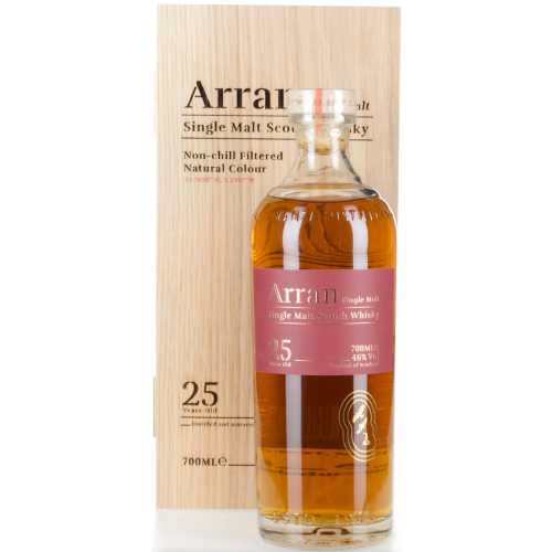 Der Arran 25 Years ist ein würziger und fruchtiger Whisky. Er dürfte vor allem den Geschmack von Whiskyliebhabern treffen, die es nicht zu rauchig mögen. In der Nase tritt er kräftig auf mit reichhaltigen Eichennoten, Muskat und gebackenen Feigen. Am Gaumen kommen Zartbitterschokolade und Nuancen von dunklen Früchten durch. Im Finish läuft der älteste Arran Whisky schließlich zur Höchstform auf mit einem Feuerwerk aus Gewürz- und Zimtnoten, Zitrusaromen und Schokolade.