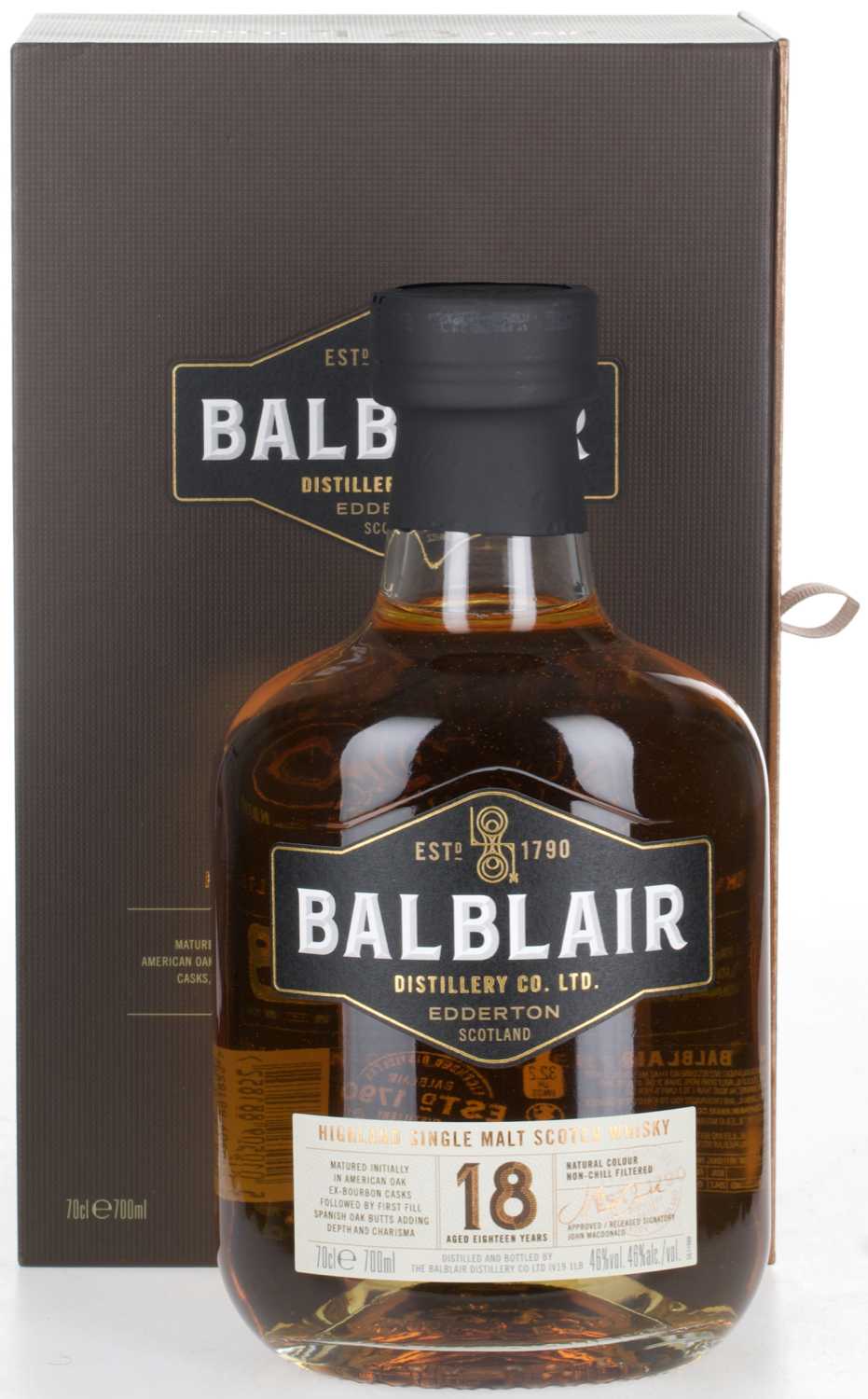 Der Balblair 18 Years ist ein Single Malt Scotch Whisky aus der Balblair Distillery in Edderton. Er ist die dritte Veröffentlichung der neuen Reihe der Distillery mit Age-Statement. Die Einführung der neuen Kollektion läutet für Balblair eine neue Ära ein. Seit April 2019 ist die edle, lang gealterte Reihe der Balblair Whiskys auf dem Markt. Allerdings bleibt Balblair seinem Hausstil treu und verfolgt weiterhin einen durchdachten Ansatz, bei dem Qualität vor Quantität steht. Ein Attribut, das die Destillerie erfolgreich und weltweit bekannt gemacht hat. Auch bei dem Balblair 18 Years setzt sie auf dieses Konzept. Der 18 Jahre alte Whisky aus den Northern Highlands überzeugt auf ganzer Ebene. Schon die Verpackung der neuen Kollektion spiegelt die einzigartige und idyllische Lage der Distillery wieder, durch das Logo der piktischen Zeichen, die auf den alten Stein direkt vor der Destillerie geätzt wurden. Die natürliche Farbe geölter Zeder und der Verzicht auf Kaltfiltrierung lassen auf den wertvollen Inhalt schließen. Gereift wurde der Single Malt in amerikanischen Ex-Bourbon-Fässern und dann in spanischen first-fill Eichenfässern.