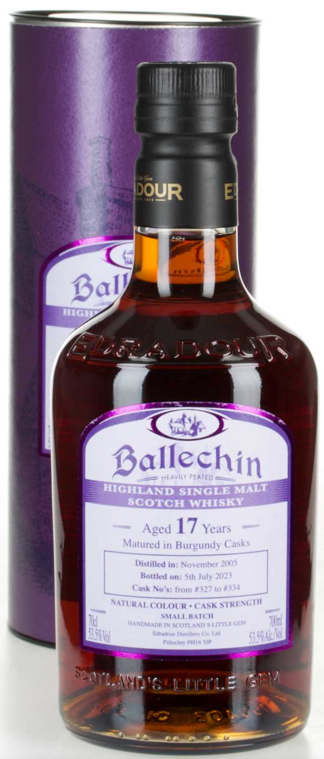 17 Jahre gingen ins Land; Symington ist noch immer verantwortlich für die Geschicke bei Edradour und bei seinem Erstlingswerk Signatory Vintage und wählte ebenso verantwortungsvoll die Fässer für die limitierte Abfüllung aus. Die Fässer mit der Nummer 327 bis 334 reichten für 2103 Flaschen; in Fassstärke. Auch aromatisch hat der Ballechin 17 y.o. Burgundy Casks einiges zu bieten und wartet beim Nosing mit Lakritz, Leder und Kirschmarmelade auf. Am Gaumen erweitert sich das Profil um dunkle Früchte wie Pflaumen, Kirschen und Brombeeren. Rauch ist bei diesem stark getorften Malt natürlich allgegenwärtig.
