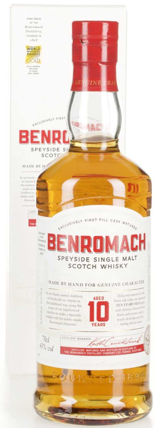 Benromach 10 Year Old ist ein Single Malt Whisky, der der Whiskytradition der schottischen Speyside gewidmet ist. Dies bedeutet, dass für seine Herstellung ein wenig Torffeuer verwendet wurde, so wie es in den Zeiten vor den 1960er Jahren üblich war, wenn nicht genügend Kohle zum Darren des Malzes verfügbar war. Die Reifezeit verbrachte dieser Whisky zunächst in ehemaligen Bourbon Fässern (zu 80%) und ehemaligen Sherry Fässern (zu 20%), ehe er für das letzte Jahr komplex in first fill Oloroso Sherry Fässer gelegt wurde.