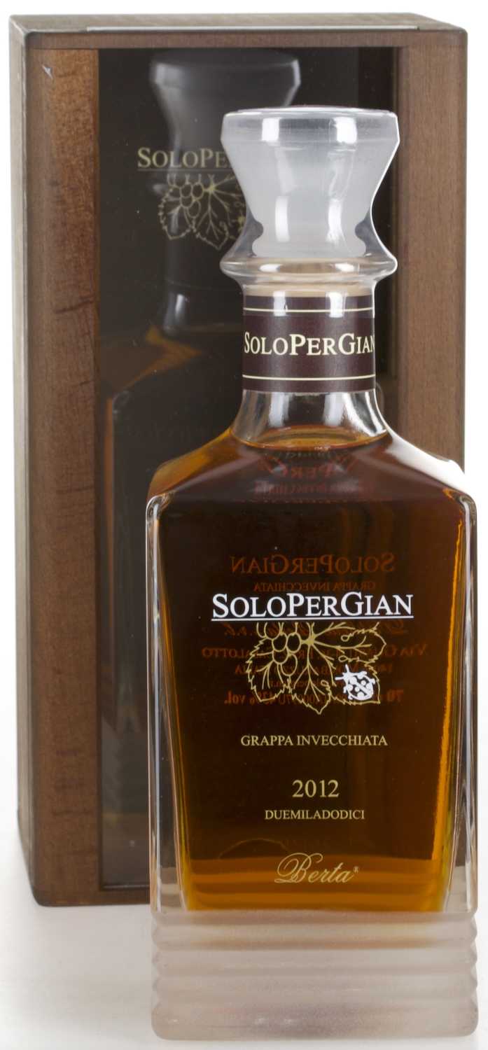 Der Solopergian ist ein edler Grappa aus der renommierten italienischen Destillerie Berta. In der im Piemont gelegenen Brennerei wurde dieser Brand im neuen Reifekeller in 100-Liter Fässern ausgebaut. In Solo per Gian verschmelzen die drei hauseigenen Grappas Tre Soli Tre aus der Sorte Nebbiolo, Roccanivo aus Barbera und Bric del Gaian aus Moscato zu einer neuen eleganten Geschmackskomposition. 2007 wurden diese hergestellt und miteinander vermählt, bevor sie für zehn Jahre in Holzfässern heranreiften. Dabei lagerte der Brand zuerst für acht Jahre in Fässern mit 1200 Liter Fassungsvermögen und anschließend in 100-Liter Fässern.