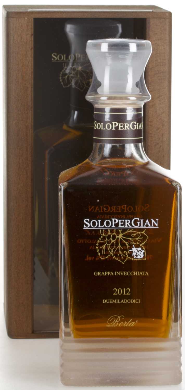 Der Solopergian ist ein edler Grappa aus der renommierten italienischen Destillerie Berta. In der im Piemont gelegenen Brennerei wurde dieser Brand im neuen Reifekeller in 100-Liter Fässern ausgebaut. In Solo per Gian verschmelzen die drei hauseigenen Grappas Tre Soli Tre aus der Sorte Nebbiolo, Roccanivo aus Barbera und Bric del Gaian aus Moscato zu einer neuen eleganten Geschmackskomposition. 2007 wurden diese hergestellt und miteinander vermählt, bevor sie für zehn Jahre in Holzfässern heranreiften. Dabei lagerte der Brand zuerst für acht Jahre in Fässern mit 1200 Liter Fassungsvermögen und anschließend in 100-Liter Fässern.