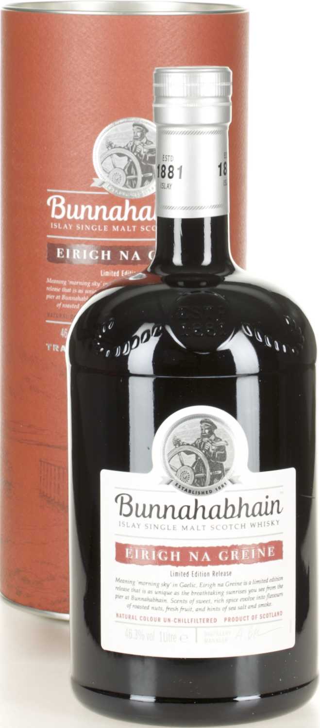 Bunnahabhain Eirigh Na Greine ist ein ausgewogener, ohne Kältefiltrierung und ohne Zusatz von Farbstoffen abgefüllter Islay Single Malt. In seinem Bouquet erkennt man sofort die für Bunnahabhain typische elegante und gut eingebundene Torfnote. Im Geschmack sind die Whiskys der Destillerie Bunnahabhain sehr harmonisch. Das kommt unter anderem durch das Wasser zustande, das durch Kalkstein aufsteigt und durch die direkte Ableitung keinen Torf mehr aufnimmt.