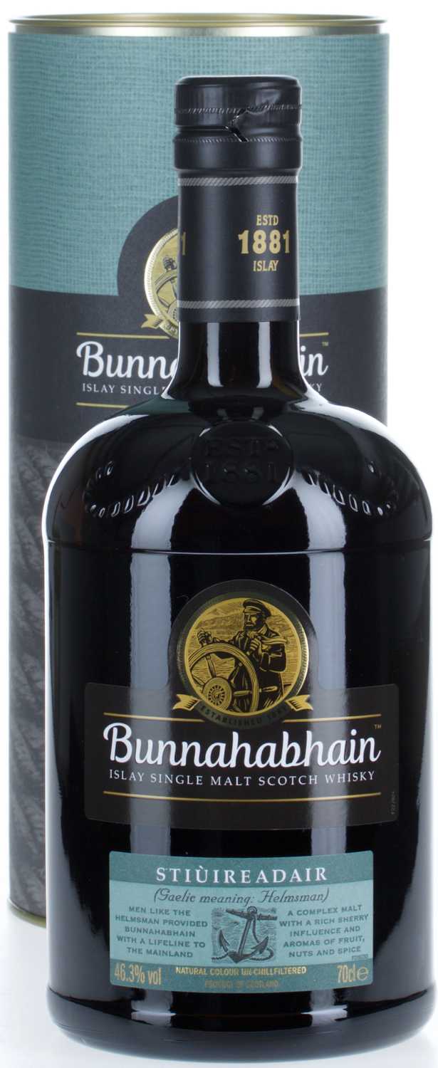 Bunnahabhain Stiúireadair stammt aus der gleichnamigen Brennerei Bunnahabhain von der Insel Islay, die Nördlichste Schottlands, die für die Produktion toller Whiskys bekannt ist. Die direkte Nähe zum Meer und die intensive Salzluft üben während der Lagerung nachhaltigen Einfluss auf die Whiskys von Bunnahabhain aus. Der Bunnahabhain Stiúireadair ist eine Vermählung von Destillaten, die in verschiedenen First und Second Fill Sherry Casks aus verschiedenen Lagerhäusern lagern durften. Durch die Sherry Fässer erhält der Bunnahabhain Stiúireadair seine beliebte Fruchtbetonung und einen hellen Bernsteinton.