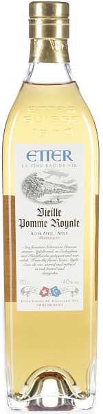 Etter Vieille Pomme Royale ist ein im Holzfass gereifter Brand aus zuvor per Hand gepflückten Gravensteiner Äpfeln. Nach der Destillation erfolgt eine dreijährige Reifung, welche diesem Apfelbrand seinen besonderen Charakter verleiht. Die Fruchtigkeit der Äpfel verbindet sich wunderbar mit der, durch die Fassreifung erreichten, Holznote. Etter Vieille Pomme Royale ist das Resultat ausgefeilter Brenn- und Küferkunst.