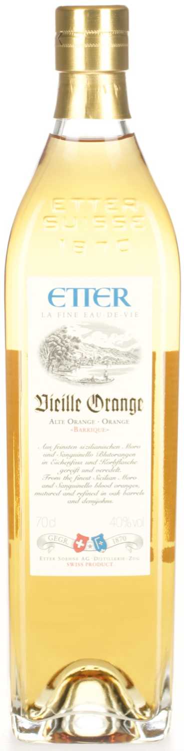 Der Vieille Orange von Etter ist ein Blutorangenbrand mit den sizilianischen Orangensorten Moro und Sanguinello. Für die Herstellung werden nur die Feinsten der aromatischen Blutorangen aus Italien ausgewählt. Diese werden dann nach einem zeitintensiven und aufwendigen Verfahren geschält, woraufhin die aromareichen Schalen und Teile des saftigen Fruchtfleisches zur Vergärung in Edelstahltanks gelagert werden. Dann folgt die Destillation. Ist diese erfolgreich überstanden wird das Destillat aufgeteilt. Der eine Teil wird in 50-Liter-Korbflaschen gelagert und der andere Teil in 225-Liter-Eichenfässern. Die Reifung dauert dann noch 18-24 Monate. Danach werden beide Teile wieder zusammengefügt und die goldbraune Flüssigkeit wird in eine edle, viereckige Glasflasche mit goldenem Verschluss und klassischer Schrift auf dem Etikett abgefüllt.