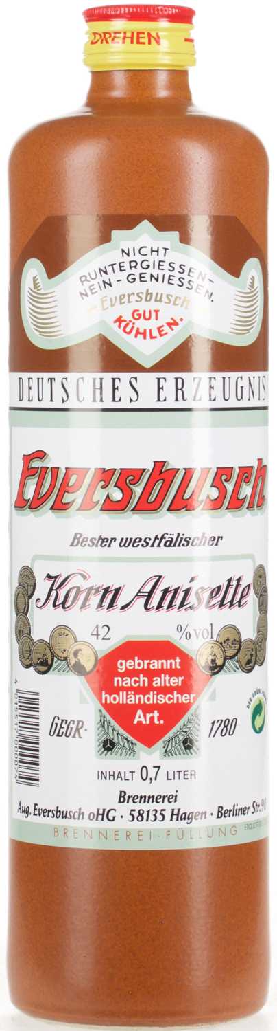 Die Korn Anisette aus der mehrfach prämierten Brennerei Eversbusch ist ein echter Juwel des Ruhrgebietes. Seit 1780 ist die Brennerei in Haspe, einem Ortsteil von Hagen, tätig und brennt dort in Familienhand die Eversbuscher Korn Anisette. Bereits in der siebten Familiengeneration wird das Destillat aus Anis und Sternanis hergestellt und ist eine echte Besonderheit. Korn Anisette ist vor allem eine Paradedisziplin unter französischen und schweizer Brennereien. In Deutschland begann alles mit Peter Christoph Eversbusch, der in der damaligen Chaussee Cölln-Berlin die Arbeit der dortigen Wachholderbrennerei aufnahm. Seitdem wird nach altem Originalrezept und unter stets gleichbleibender Qualität gebrannt. Noch heute werden Führungen durch die alte Brennerei angeboten, in der nach wie vor in den denkmalgeschützten Anlagen und der traditionsreichen Destille gebrannt wird.