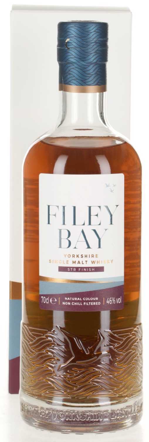 Gereift ist der Whisky für mehrere Jahre in Bourbon-Fässern. Sein Finish erhält er in geshaveten, getoasteten und angekohlten Rioja-Barriques. Sie sorgen für Untertöne von roten Früchten im Aroma und am Gaumen. Auch Zitrusfrüchte und Karamell finden sich im Aroma des Filey Bay STR Finish wieder. Insgesamt besticht dieser Single Malt Whisky durch seine komplexe Struktur. Diverse Sommerbeeren unterstützen seine dezenten floralen Noten. Für weitere Süße sorgen Anklänge von Vanille-Eiscrème, Orangen und Schokolade. Bedingt durch den Lagerungsprozess ist auch ein Touch getoastete Eiche erkennbar.