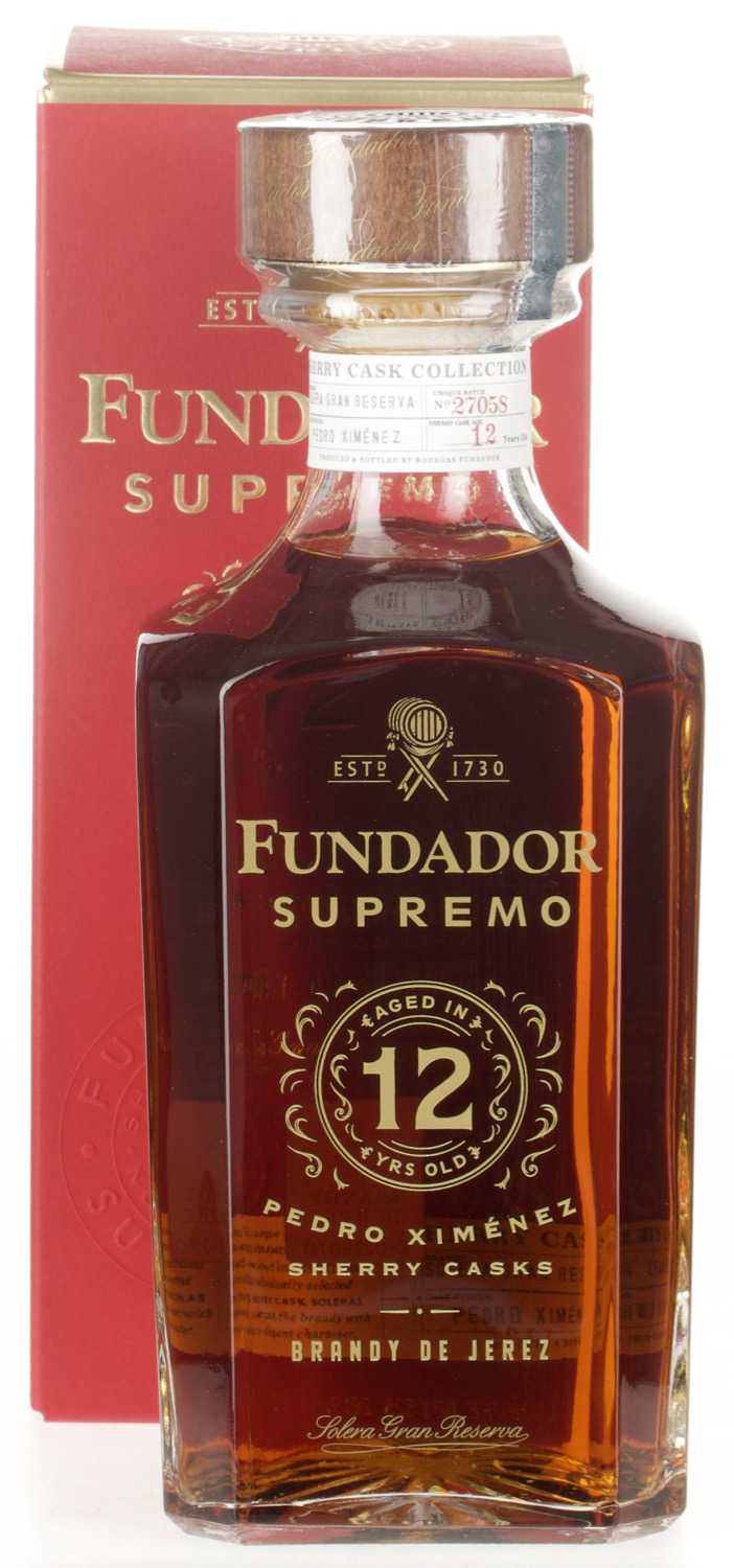 Der Fundador Supremo 12 Years Solera Gran Reserva ist ein edler Brandy von Bodegas Fundador Pedro Domecq, kurz Bodegas Domecq. Gegründet wurde das Unternehmen im Jahr 1730 in der spanischen Stadt Jerez de la Frontera, wo sein Sitz noch heute liegt. Für ihren Brandy verwendet Bodega Domecq ausschließlich Trauben der prestigeträchtigsten Weinberge Spaniens. Ausgesucht und gebrannt werden sie von Bodega Domecqs eigenen Master Distillern. Die Trauben reifen in Eichenfässern, in denen zuvor der hauseigene Pedro-Ximénez-Sherry lagerte. Der Name lässt es schon vermuten: Insgesamt beträgt die Reifezeit 12 Jahre. Nach der Reifung wird für den Fundador Supremo 12 Years Solera Gran Reserva ausschließlich der beste Brandy gewählt und behutsam geblendet.