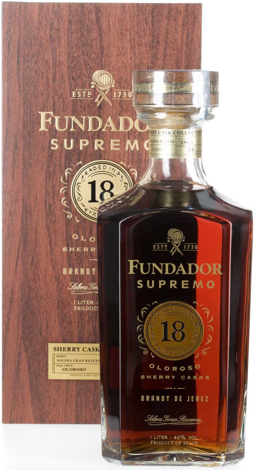 Der Fundador Supremo 18 Jahre wird aus handverlesenen Trauben von Spaniens besten Weinlagen destilliert. Für die Reifung im Solera-Verfahren kommen ausschließlich sorgfältig selektierte Fässer zum Einsatz, in denen zuvor besonders alter, edler Oloroso-Sherry gelagert wurde. Nur die besten der gereiften Brandys wurden für diese limitierte Edition ausgewählt und vom Meisterdestillateur der traditionsreichen Bodega Fundador mit größter Sorgfalt zu einem exquisiten Geschmackserlebnis komponiert.
