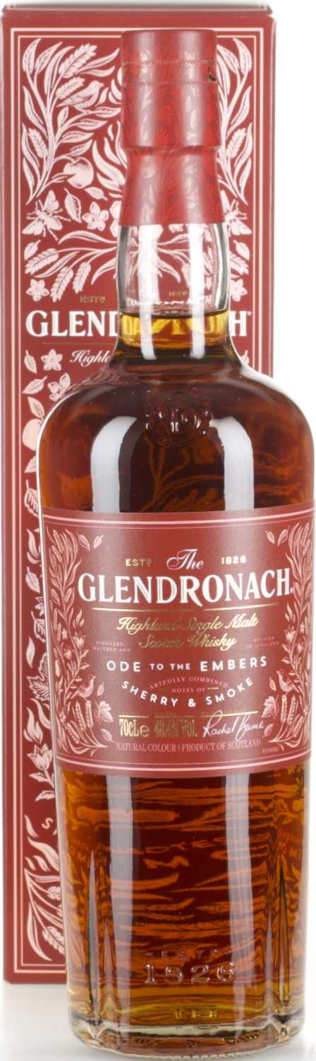 Fakt ist, dass der Glendronach Ode to the Embers nicht kältefiltriert ist und ohne zusätzliche Färbung auskommt. Darüber hinaus ist die "Ode an die Glut" die einzige Abfüllung der The Master's Anthology, bei der getorftes Malz zum Einsatz kam. Abgefüllt wird mit 48,4 Volumenprozenten Alkohol, was quasi das Bindeglied zwischen dem Glendronach Ode to the Valley und dem Ode to the Dark darstellt.