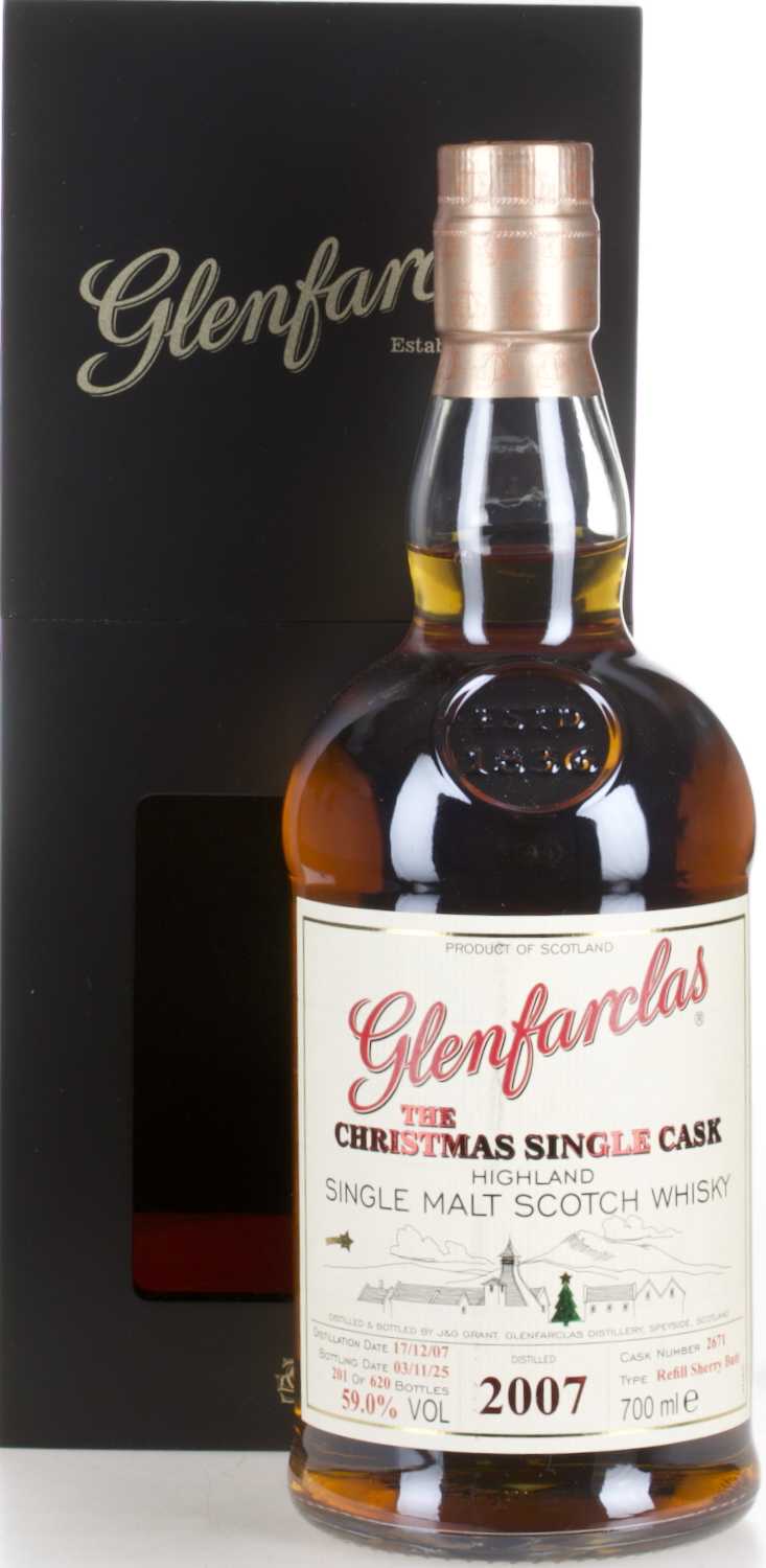 Glenfarclas The Christmas Single Cask - Vintage 2007 - ist eine besondere Einzelfassabfüllung, die exklusiv zur Weihnachtszeit erscheint und als erste Christmas-Single-Cask-Edition der Brennerei einen außergewöhnlichen Stellenwert besitzt. Der Whisky wurde am 17. Dezember 2007 destilliert und reifte über viele Jahre in einem Refill Oloroso Sherry Butt (Cask 2671), bevor er in naturbelassener Qualität abgefüllt wurde - ohne Kältefiltration, ohne Farbstoffe und in authentischer Fassstärke.