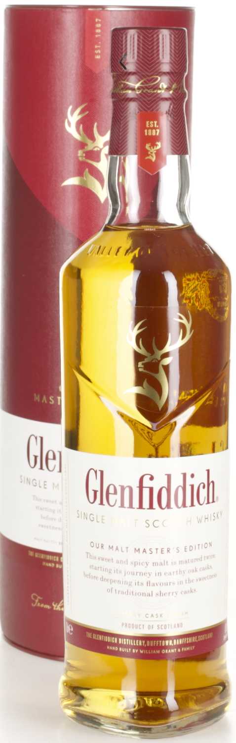 Glenfiddich Malt Master's Edition ist zu Ehren von Brian Kinsman, dem sechsten Malt Master der Brennerei, aufgelegt worden. Zum ersten Mal bedient sich das Haus Glenfiddich einer doppelten Reifung in zwei unterschiedlichen Fasstypen. So erfolgt zunächst eine traditionelle Reifung in Eichenfässern und anschließend eine Veredlung in ehemaligen Sherryfässern. Hierdurch entsteht ein rubinroter Whisky mit kräftigem Vanillearoma und einer ansprechenden Würze und dezenten Rauchigkeit. Am Gaumen besitzt dieser Whisky eine tolle Fruchtnote. Pflaumen und Kirschen wechseln sich in Harmonie ab. Das Finish ist mittellang und äußerst ausbalanciert.