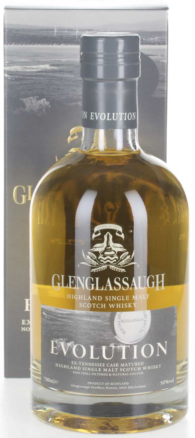 Der Evolution wird durch einen einzigartigen Reifeprozess gewonnen bei dem nur handverlesene ehemalige Tennessee Whisky Fässer, der Brennerei George Dickel, Verwendung finden, welche zum ersten Mal neu befüllt werden. Dadurch entwickelt dieser Highland Malt eine unwahrscheinliche Tiefe und einen Charakter mit großer Finesse. Der Evolution soll die Philosophie des Hauses Glenglassaugh widerspiegeln und den Genießer, die Landschaft aus der er stammt spüren lassen.