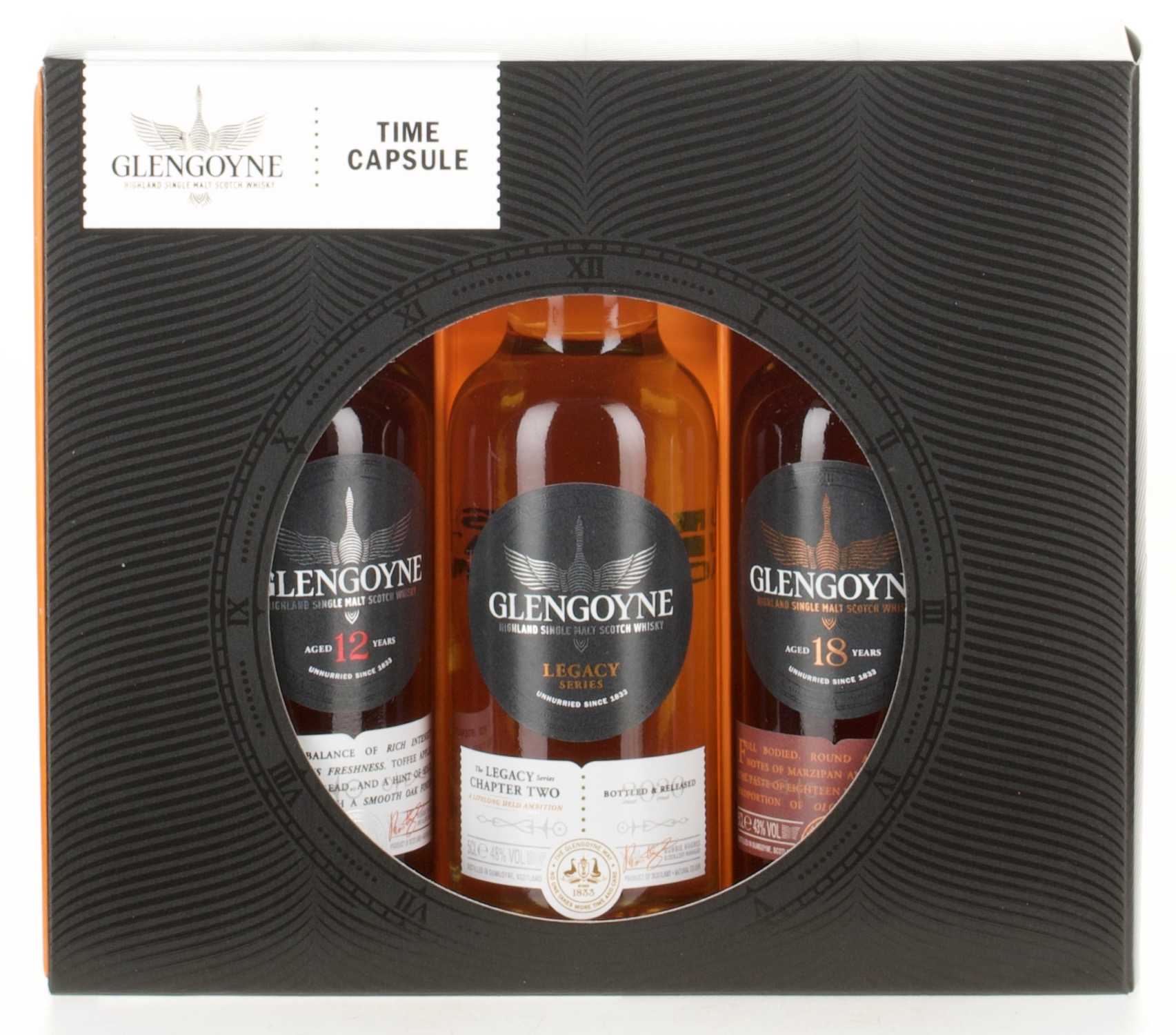Die Time Capsule enthält drei der meistausgezeichneten Whiskys von Glengoyne. Sie lädt dazu ein, innezuhalten und einen ruhigen Blick in und auf die Vergangenheit der Brennerei aus Schottland zu werfen - eine waschechte Zeitkapsel, die ihrem Namen gerecht wird. Dank der praktischen Probiergröße der Flaschen und der eleganten schwarzen Verpackung eignet sich die Glengoyne Time Capsule ideal als Geschenk für Freunde oder Ihre Lieben. Und natürlich für alle, die sich mit den Whiskys von Glengoyne vertraut machen möchten.