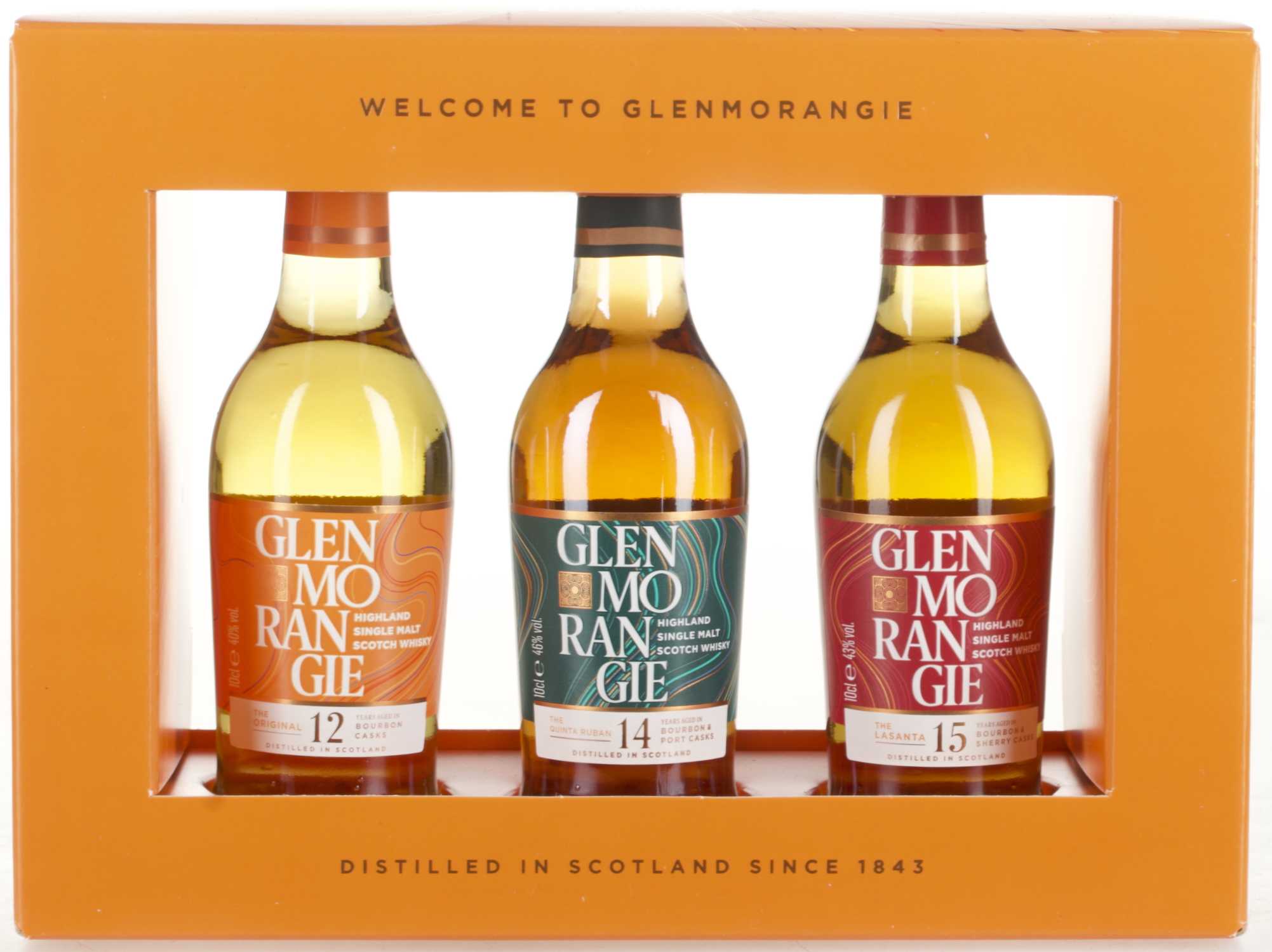 Das Glenmorangie Taster Pack ist eine ideale Möglichkeit die Welt von Glenmorangie kennenzulernen. Es besteht aus je einer 0,10l-Flaschen Glenmorangie Original, Lasanta und Quinta Ruban. Somit kann jeder Geniesser und Whisky interessierte die verschiedenen Einflüsse von Sheryy- und Portwein-Fässern entdecken und sein praktisches Whisky-Wissen erweitern. Die schöne Geschnkpackung, in der das Set kommt, macht es auch zu einem idealen Geschenk.