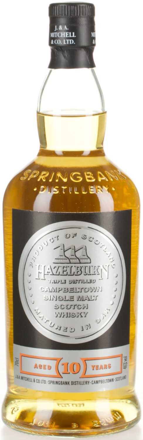 Hazelburn 10 Years ist ein dreifach destillierter Single Malt Whisky aus der Brennerei Springbank. Wie jeder Whisky aus der Hazelburn Reihe, so ist auch dieser Malt ungetorft und ohne Kältefiltration und Farbstoff abgefüllt. Die Reifung dieses Whiskys erfolgte in ehemaligen Bourbon Fässern, die ihm eine ansprechende hellgoldene Farbe verliehen haben.