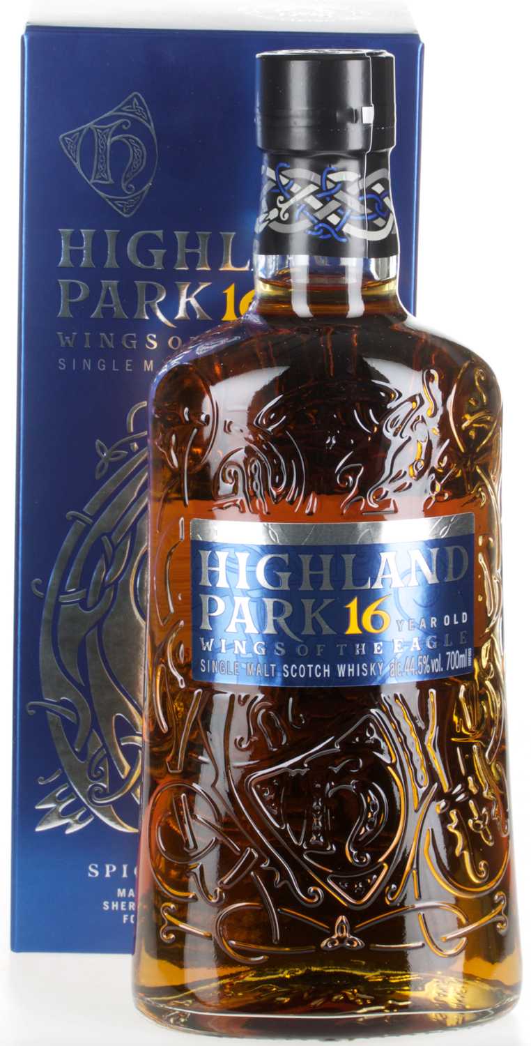 Werden auf Erzählungen der Wikinger vertraut, dann repräsentiert ein mächtiger Adler Weisheit und Wissen. Ein Flügelschlag des Adlers erzeugt Winde. Die auf Orkney wehenden Winde führen auf Dauer dazu, dass keine Bäume im Moor- und Torfgebiet vorhanden sind. Das beschriebene Gebiet erzeugt die einzigartige, aromatische Rauchigkeit des Highland Park 16 Years und hat folglich den Zusatz "wings of the eagle" erhalten.