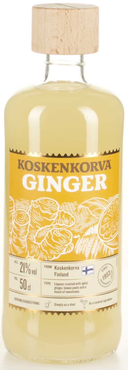Koskenkorva Ginger ist ein moderner Likör, der die reine Klarheit finnischen Vodkas mit der lebendigen Würze frischen Ingwers verbindet. Die Basis bildet der in der kleinen Ortschaft Koskenkorva destillierte Vodka, der aus nachhaltig angebauter nordischer Gerste und reinem Quellwasser hergestellt wird. Anschließend wird er mit echtem Ingwer verfeinert, wodurch eine harmonische Balance aus Schärfe, Frische und milder Süße entsteht.