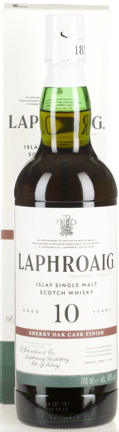 Der 10 Years Sherry Oak Finish ist ein für zehn Jahre gereifter Single Malt Whisky der schottischen Brennerei Laphroaig. Sie liegt im Süden der kleinen Insel Islay, die als eine der bekanntesten Whiskyregionen des Landes gilt. Nachdem die lange Praxis des illegalen Brennens in Schottland Anfang des 19. Jahrhunderts ein Ende fand, gründeten die Brüder Donald und Alexander Johnston die Brennerei. Noch heute folgt Laphroaig ihrer 200-jährigen Tradition aus den Gründertagen. So stechen sie das für seinen unverwechselbaren Geschmack bekannte Islay-Torf per Hand und mälzen ihre Gerste selbst. Wie schon damals liefert der Fluss Kilbride Stream das für die Whiskyproduktion notwendige Wasser, das besonders weich, torfig und nicht mineralisiert ist. Selbst die aus dem Jahr 1840 stammenden Torföfen werden weiterhin benutzt.