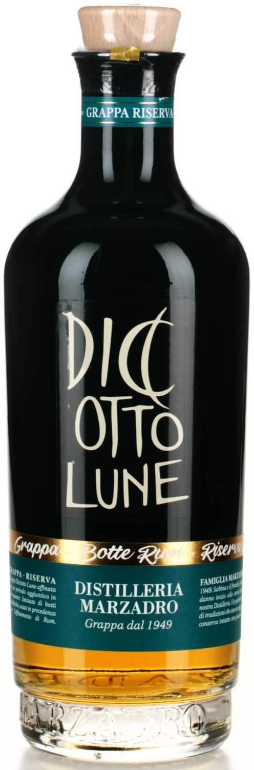 Diciotto Lune bedeutet auf Deutsch übersetzt 18 Monde und bezieht sich auf die Reifezeit des Grappa Stravecchia aus der Distilleria Marzadro. Bei dieser Sonderedition ist der Name allerdings etwas irreführend, denn die Spirituose reift nicht nur 18 sondern ganze 36 Monate. Dieser hochwertige Grappa wird aus Trester von 70% roten und 30 % weißen Trauben aus dem Trentino in Italien hergestellt. Dazu gehören die Rebsorten Marzemino, Teroldego, Merlot, Muskateller und Chardonnay. Die ersten 18 Monate lagert der Marzadro Riserva in kleinen Fässern aus verschiedenen Hölzern, darunter Eiche, Kirsche, Robinie und Esche, was ihm seine intensive Würze verleiht. Danach folgt eine Alterung für weitere 18 Monate in Rumfässern aus Martinique und Jamaika. Dadurch erhält der Marzadro Le Diciotto Lune sein einzigartiges Aromenprofil.