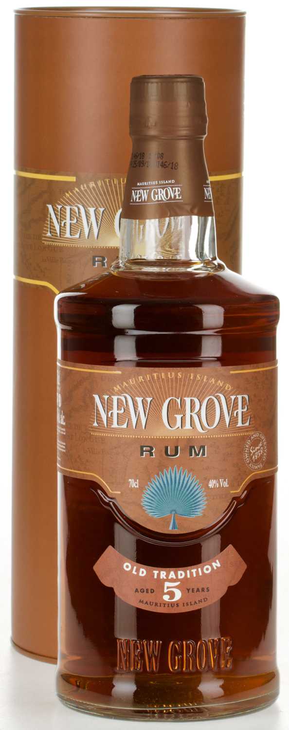 New Grove Old Tradition 5 Years ist ein Rum von der Insel Mauritius. Für seine Herstellung wird ausschließlich Melasse verwendet, die aus einheimischem Zuckerrohr hergestellt worden ist. Diese wird mit Wasser versetzt und anschließend bei kontrollierter Temperatur vergoren. Die Destillation erfolgt im Column Still Verfahren, welches sehr leichte und reine Destillate hervorbringt. Das Besondere am New Grove 5 Years ist das Reifungsverfahren. Hier kommen sowohl Fässern aus Limousin Eiche als auch ehemalige Portweinfässer zur Verwendung. Die Kombination verleiht dem Rum einen speziellen Charakter, wobei hier vor allem die ehemaligen Portweinfässer zu nennen sind, die dem Rum einen leicht -weinigen- Charakter verleihen.