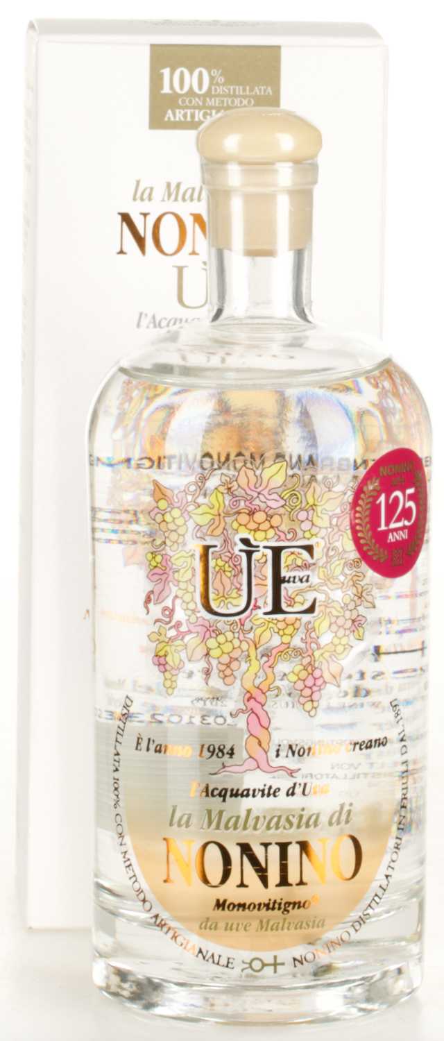 Nonino Uè la Malvasia ist ein rebsortenreiner Traubenbrand. Die Spirituosensorte Ùe wurde von den Noninos selbst kreiert und 1984 vom italienischen Staat anerkannt. Für die Herstellung werden ausgesuchte, regional bezogene Malvasia Trauben verwendet. Das Besondere ist die Tatsache, dass die Trauben mitsamt ihrer Schale vergoren und destilliert werden, was dafür sorgt, dass sich im fertigen Destillat die Finesse der Trauben mit der Kraft des Tresters vereint. Nach Abschluss der Destillation reift der Nonino ÙE Malvasia für bis zu ein Jahr in Edelstahltanks heran.