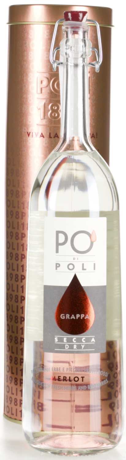 Po di Poli Secca ist eine sortenreine Grappa für deren Herstellung nur Trester der Rebsorte Merlot verwendet wurden. Das Bouquet und der Geschmack werden daher durch das typische Merlot-Aroma geprägt. Der klare Duft nach frischem Most, frisch gemähtem Gras und Hyazinthe spricht für die außerordentliche Qualität des Destillats. Der Geschmack ist äußerst vollmundig und kraftvoll. Gleichzeitig ist die Mundstruktur sehr gefällig und elegant.