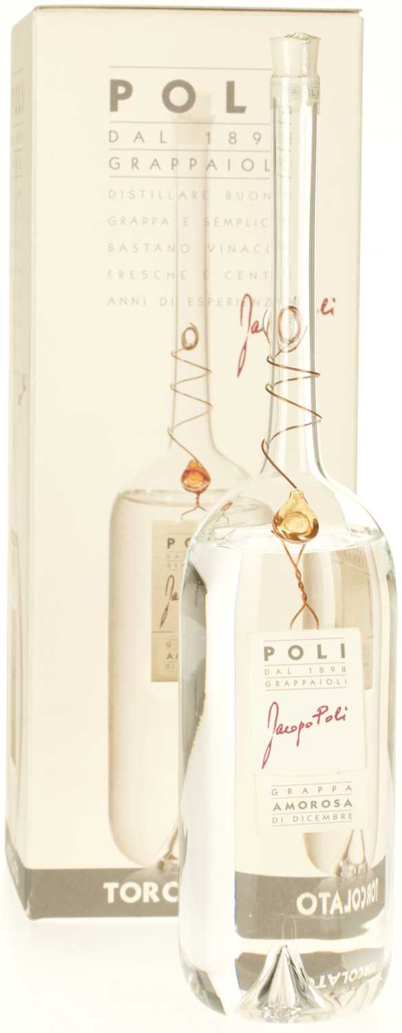 Jacopo Poli Amorosa di Dicembre Torcolato wird aus den gleichen Trockenbeeren destilliert aus denen auch der Wein Torcolato gekeltert wird (Vespaiolo und Tocai). Aus dieser verspäteten Destillation entsteht eine ganz besondere Grappe mit Noten von exotischen Früchten, Trockenobst und Rosinen. Der feingliedrige und raffinierte Geschmack dieses Destillats ist ausgesprochen ausbalanciert. Nicht zuletzt durch die elegante Flasche wird Jacopo Poli Amoroso di Torcolato zu einem idealen Geschenk für jeden Grappakenner.