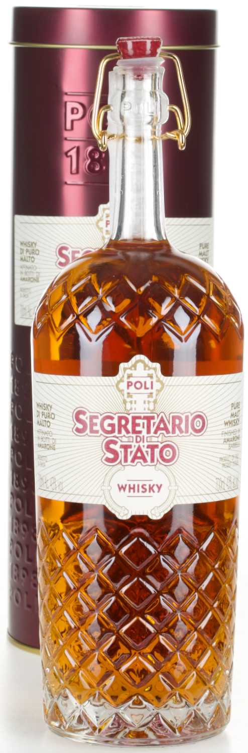 Nach dem Brennen geht es für den New Make Spirit erst einmal fünf Jahre ins europäische Eichenfass. Anschließend erhält er ein zwölfmonatiges Finish im Amarone-Fass, einem für die Region Venetien bekannten Rotwein. Wenngleich der Poli Segretario di Stato Whisky es in Sachen Alter nicht mit den wohlgereiften Schotten aufnehmen kann, so steht er in Sachen Geschmack dem Scotch in nichts nach. Der Poli Segretario di Stato Whisky zeigt sich angenehm torfig, mit Aromen von gerösteten Nüssen und getrockneten Früchten, etwas Schokolade und einem Hauch Asche im Abgang.