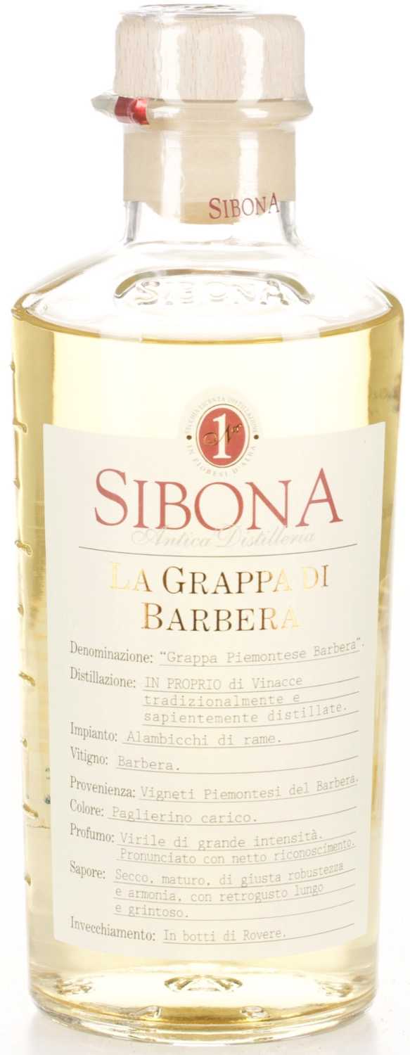 Sibona Grappa di Barbera ist eine piemonteser Grappa. Die rebsortenreine Grappa wird aus Trester der Gebiete Barbera d'Alba und Barbera d'Asti destilliert und reift anschließend in ausgesuchten Holzfässern heran, die den Geschmack vervollständigen und harmonisieren. Das Aroma ist ausgesprochen vielschichtig und mit einer schönen Blumigkeit versehen. Das Finish ist komplex und anhaltend.