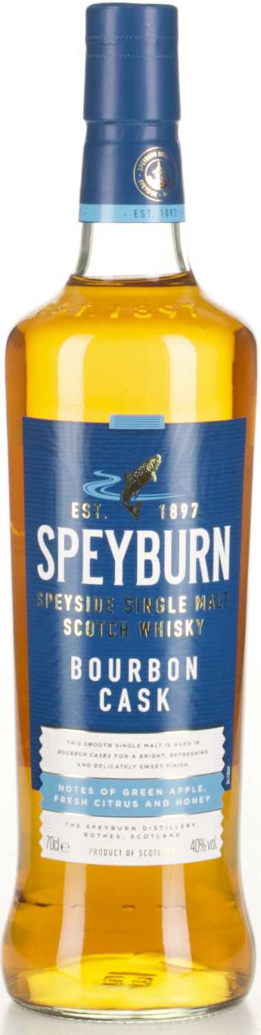 Der Speyburn Bourbon Cask ist ein frischer Single Malt Whisky aus der schottischen Region Speyside. Gereift in ehemaligen Bourbonfässern offenbart das Bouquet sanfte Noten grüner Äpfel in Verbindung mit einer schönen Zitrusaromatik und einer leichten Würze. Eine dezente Honigsüße umschmeichelt Nase und Gaumen.
