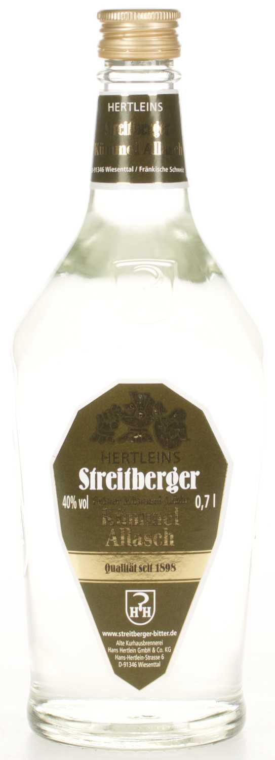 Kümmel Allasch ist ein beliebter Kümmellikör aus der Kurhausbrennerei Hans Hertlein in Streitberg. In Deutschland wird Allasch heute als Sammelbegriff für Kümmelliköre verstanden, wobei sich seine Namensgebung und sein Ursprung vom livländischen Rittergut Allasch bei Riga ableiten. Hertleins Streitberger Kümmel Allasch ist eine klare Kümmelspezialität, die mit sorgfältig ausgewähltem und besonders aromatischem Kümmel hergestellt wird. Die Deutsche Landwirtschafts-Gesellschaft prämierte ihn deshalb im Jahr 2015 mit der begehrten Goldmedaille. Das Alkoholvolumen ist mit 40% für einen Likör vergleichsweise kräftig, garantiert aber zugleich seinen ausdrucksstarken Charakter. Der optimal darauf abgestimmte Zuckergehalt verleiht dem Streitberger Allasch eine angenehme Süße und einen Geschmackseindruck. Allasch wurde bereits im Jahr 1830 auf der Leipziger Messe präsentiert und nahm die die Stadt im Sturm und erfreut sich seitdem in der gesamten Region wachsender Beliebtheit.