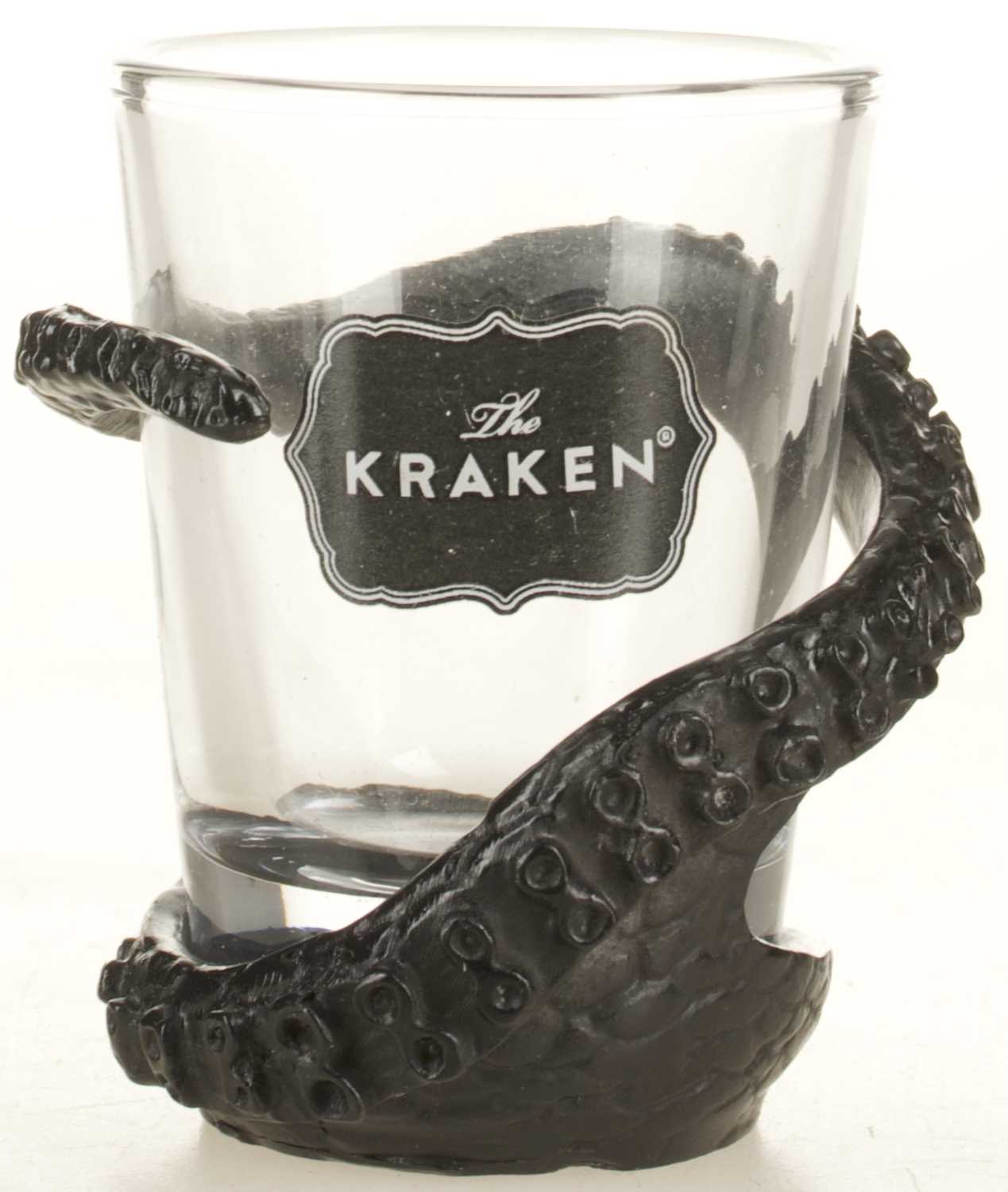 Stylisches Shotglas von Kraken mit einer Plastiktentakel, die das Glas umfasst.