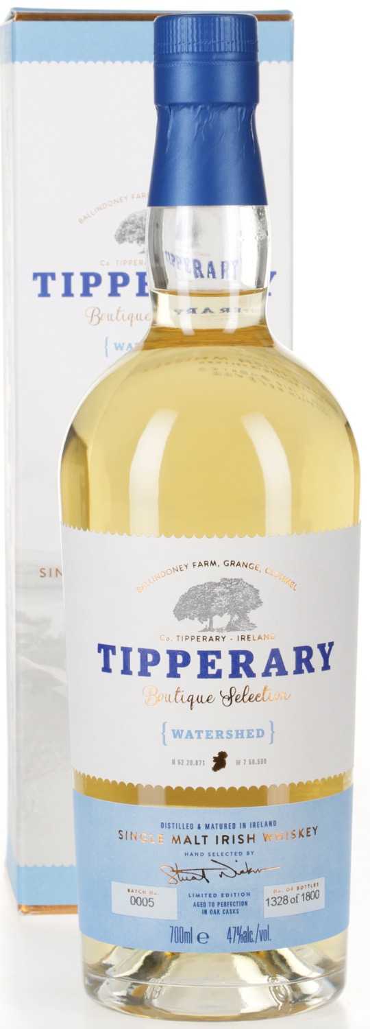 Der Watershed Boutique Selection ist ein limitierter Single Malt Irish Whiskey von der Brennerei Tipperary. Er erscheint ausschließlich in kleinen Batches, für die Malt Master Stuart Nickerson nur sechs First-Fill-Bourbonfässer ausgewählt hat. Jede der insgesamt 1916 Flaschen ist ein Unikat, da sie händisch nummeriert werden.