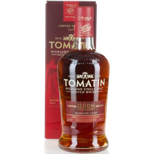 Die Destillerie Tomatin setzt bei der Herstellung ihrer Whiskys auf höchste Qualität und einen unverwechselbaren Charakter. Der Tomatin Moscatel Casks ist einer von drei Whiskys der limitierten Portuguese Collection. Alle drei Whiskys durften nach der anfänglichen Reifezeit von acht Jahren weitere sieben Jahre in Fässern lagern, die zuvor unterschiedliche Likörweine aus Portugal enthielten. Dadurch bekommt jeder der drei Malt Whiskys seine ganz individuelle Prägung. Der Tomatin Moscatel verdankt seine feinen Gewürznoten der Reifung in ehemaligen Moscatel de Setúbal-Fässern. Dieser Süßwein wird zu mindestens 85% aus den besonders aromatischen Muskatellertrauben gewonnen.