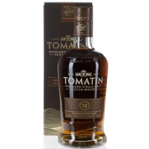 Tomatin 18 Years old ist ein Highland Single Malt aus einer der größten und gleichzeitig unbekanntesten Destillerien Schottlands. Dies beruht auf der Tatsache, dass Tomatin lange Zeit seine hochwertigen Single Malts  an große Blending Companies verkauft hat und somit nur Insidern bekannt war. Der 18-jährige Tomatin reift zunächst in europäischer Eiche und anschließend in Oloroso Sherry Fässern. Das Bukett dieses Whiskys ist äußerst intensiv mit Noten von Sherry, Äpfeln und Vanille. Ebenso erkennt man feine Raucharomen. Am Gaumen zeigen sich Eindrücke von Honig und Eiche. Weiterhin erkennt man Zitrusfrüchte und Schokolade. Das Finish des 18-jährigen Tomatins ist lang, trocken und hinterlässt einen bleibenden Eindruck.